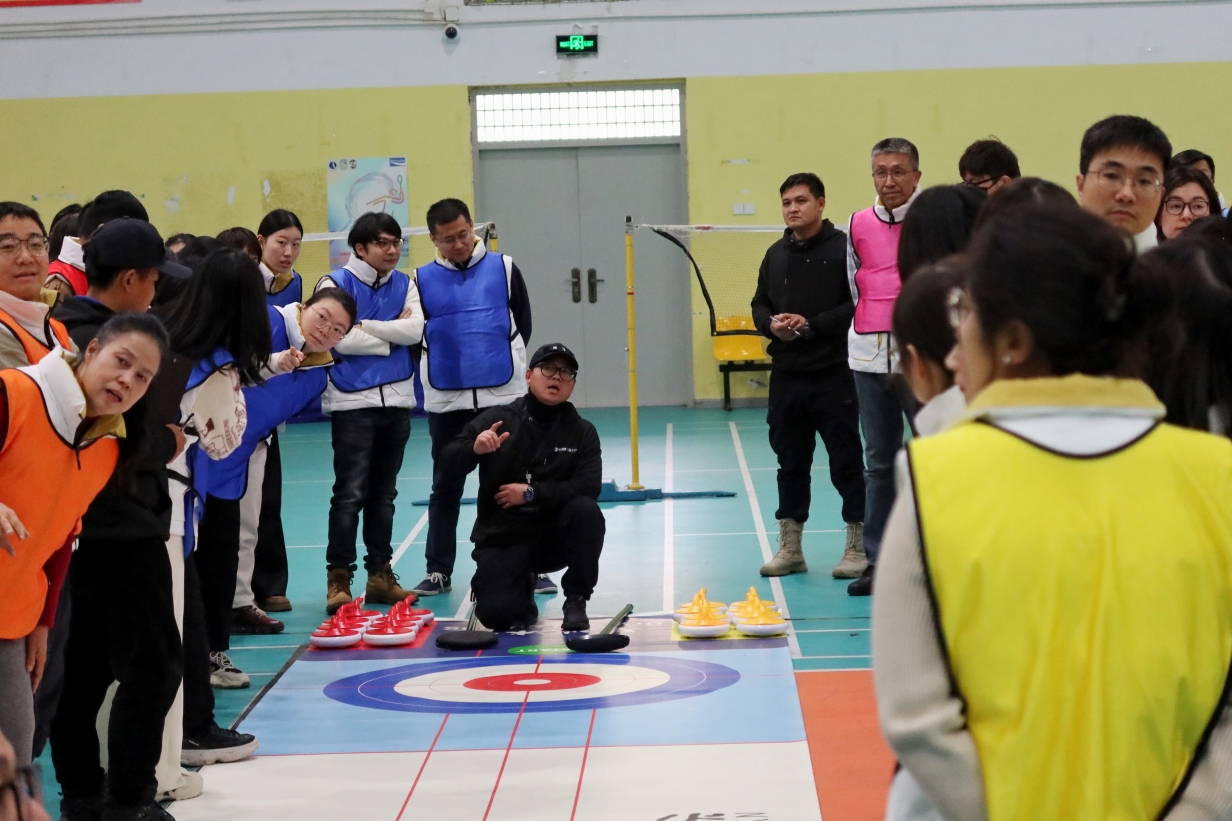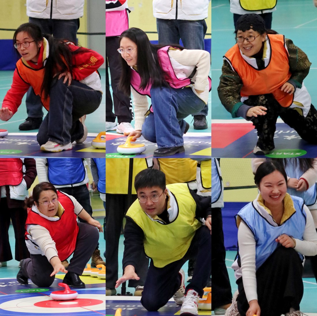会后,学院首次启航嘉年华——冰壶体验活动正式拉开序幕。活动开始前,专业教练带领大家进行了热身破冰环节,在欢声和笑声中不仅活跃了氛围,也增进情感互动与交流。老师们认真聆听了冰壶的基本规则和技巧,完成了随机分组后便开启了积分车轮赛。比赛一开始,整个场馆就充满了紧张而热烈的气氛。赛场上,每个人都全神贯注,盯着冰壶滑行的轨迹,心中默默计算着角度和力度。投掷冰壶的教职工们屏息凝神,每一个动作都力求精准无误,希望为自己的队伍赢得宝贵的分数。在旁围观的队友们也是热情高涨,每当有冰壶准确滑入圆心或者成功阻挡对手的冰壶时,现场都会爆发出一阵阵热烈的掌声,欢呼声、呐喊声、鼓掌声此起彼伏,整个场馆热闹非凡。