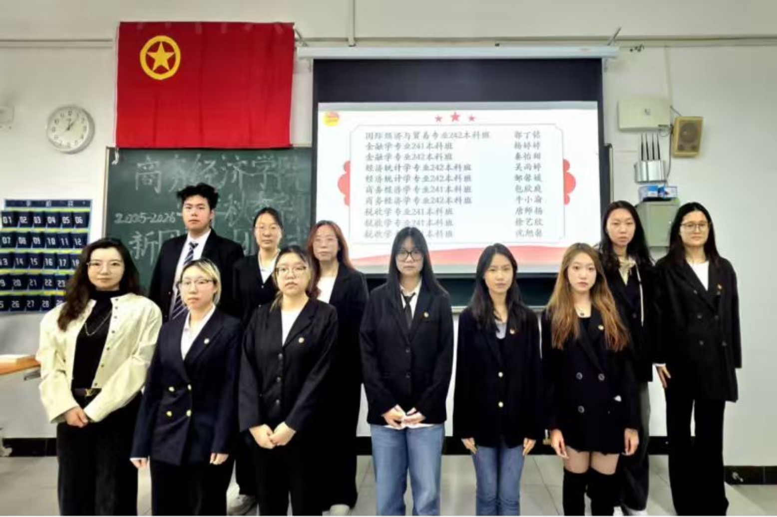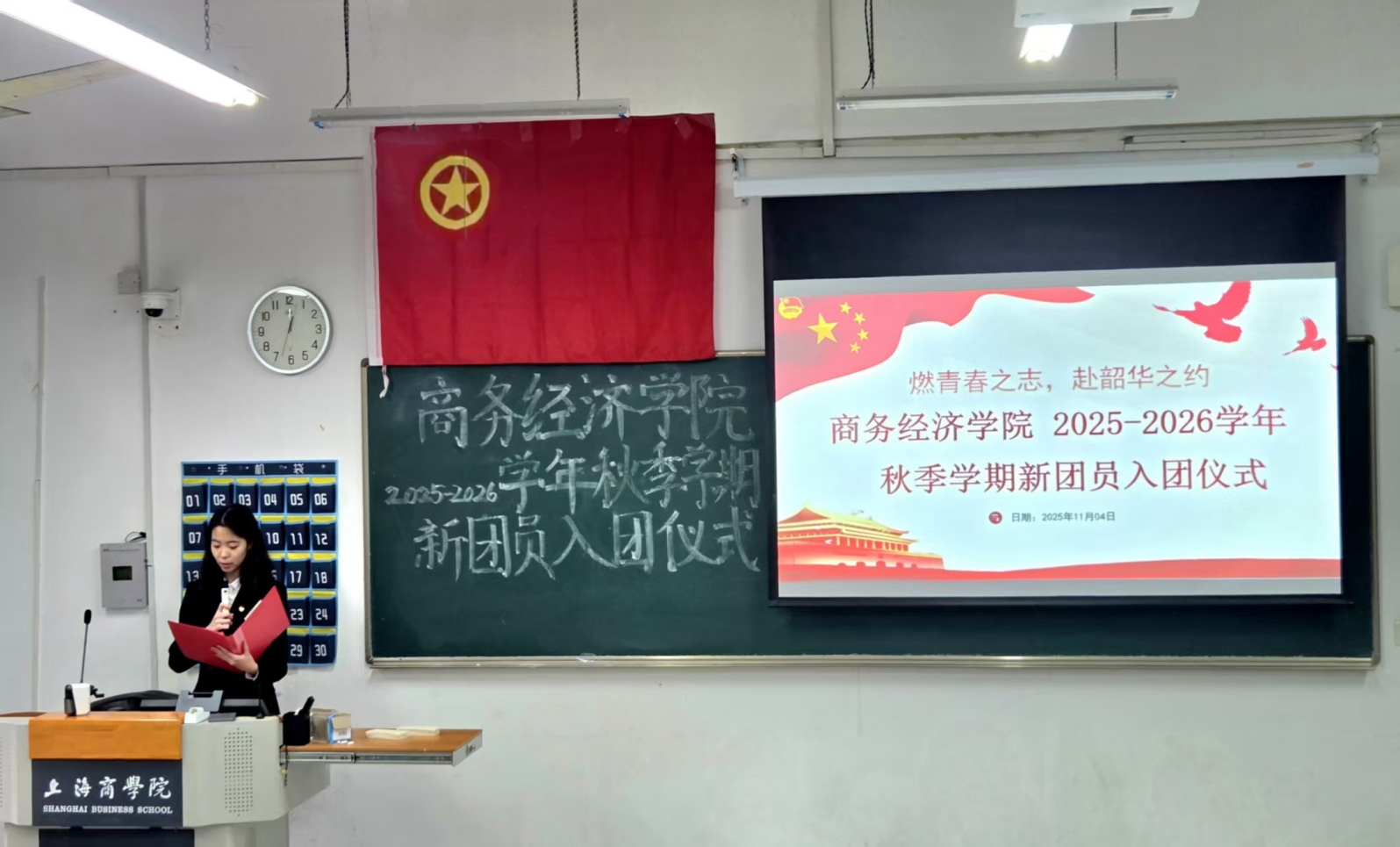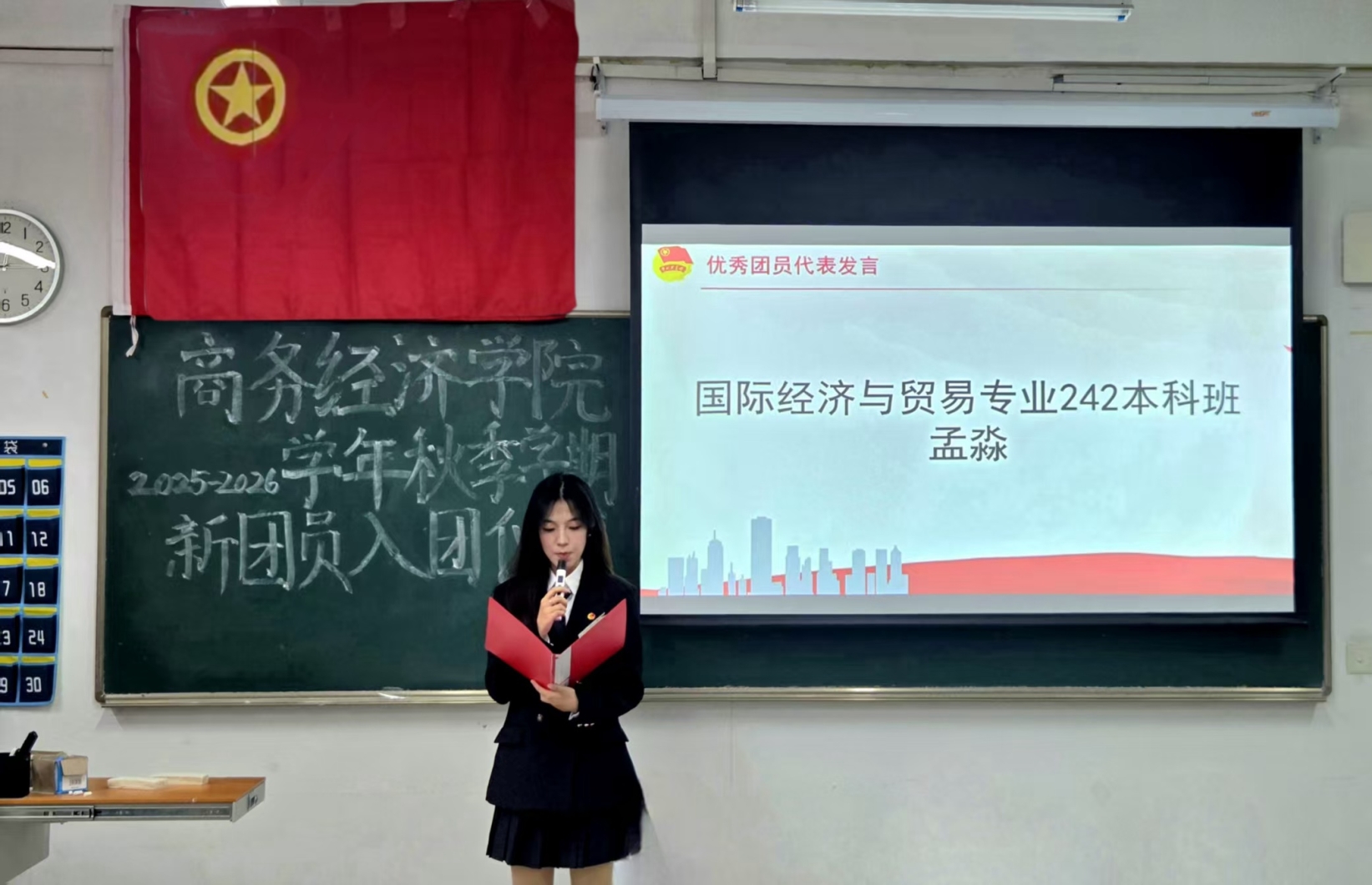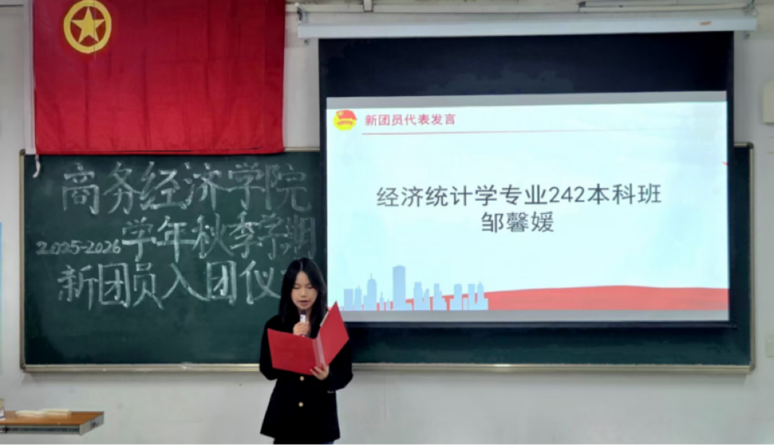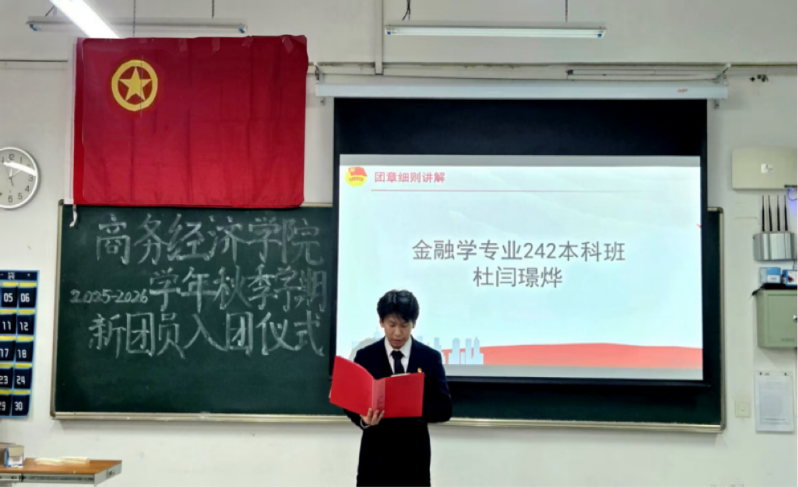 为加强团组织建设,激励广大青年团员勇担时代使命,商务经济学院团委组织部于11月4日在1-105教室举行2025-2026学年秋季学期新团员入团仪式。仪式由商务经济学院团委组织部干事王嘉仪主持,参与本次仪式的有商务经济学院团委书记邵子轩、学生辅导员陈晓艺、团委副书记冯皓玮、本学年全体新发展团员以及优秀团员代表。
