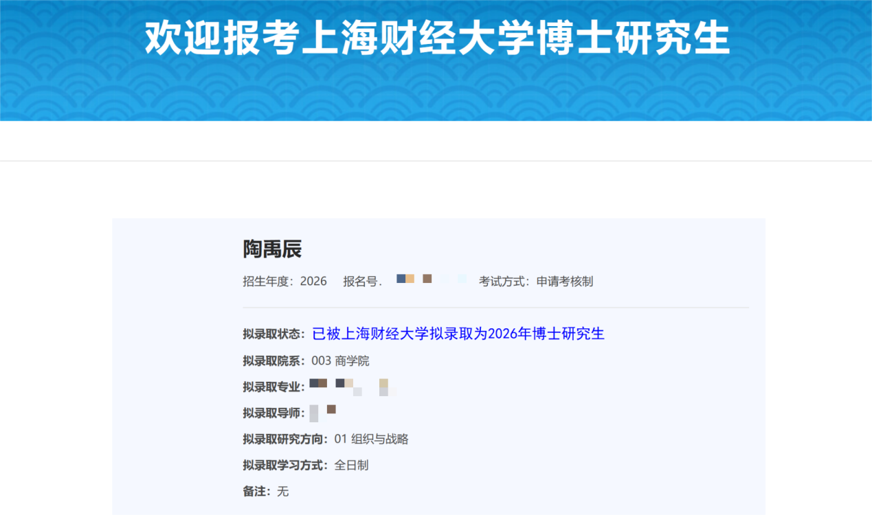 近日,2026届国际商务专业硕士研究生陶禹辰同学收到上海财经大学博士录取通知,即将进入该校攻读博士学位。这一喜讯不仅标志着陶禹辰同学个人学术生涯的新起点,更是商务经济学院深化产教研协同育人机制所取得的一项标志性成果。