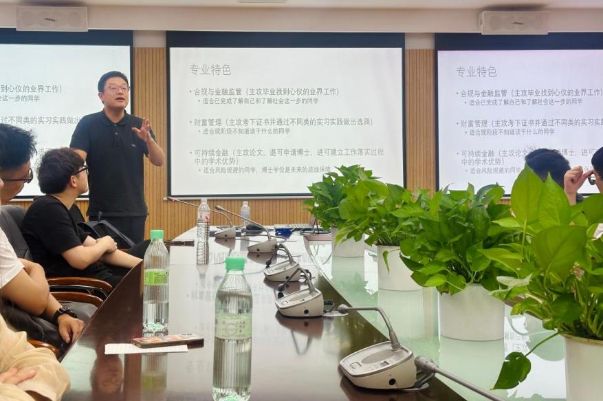同时,金融专硕(MF)新生移步1501分会场参加专场会议。高翔教授系统地介绍了MF研究生培养方案与课程设置,并重点解读了三个培养方向及其相关毕业要求。他鼓励同学们准确把握研究生阶段与本科阶段的学习差异,珍惜在校学习机会,加强与导师的沟通协作,充分利用学校各类资源,科学规划研究生生涯。高翔老师特别寄语新生,同学们在专注学业科研的同时,也要注重身心健康,保持积极乐观的心态和良好的生活规律,努力实现全面发展。