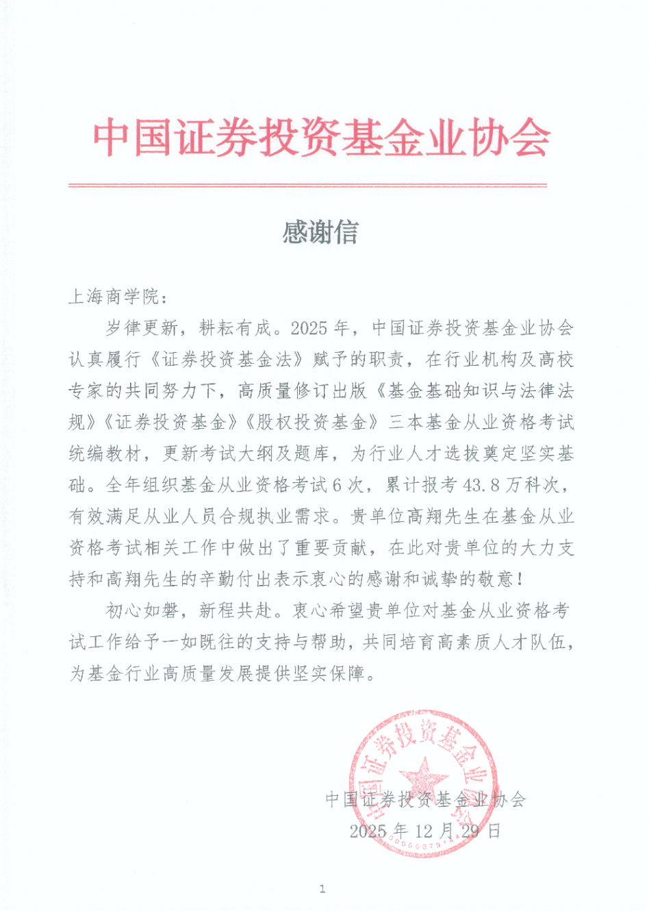 近日,商务经济学院收到来自中国证券投资基金业协会的感谢信,对商务经济学院财务金融研究所所长高翔教授在2025年度基金从业资格考试相关工作中的突出贡献表示诚挚感谢 。信中指出,高翔教授凭借深厚的专业素养,深度参与了《基金基础知识与法律法规》、《证券投资基金》及《股权投资基金》三本统编教材的高质量修订工作,并协助完成了考试大纲及题库的更新,为全国基金从业人员的合规执业与人才选拔奠定了坚实基础。