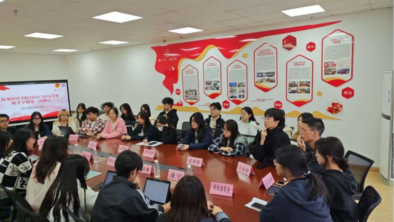 为规划新学年工作蓝图,凝聚团学骨干力量,商务经济学院第十一届团委学生会于10月21日15:30在综合楼201召开第一次团学例会。出席本次例会的有团委书记邵子轩,团委学生副书记冯皓玮、学生会执行主席余文妍、轮值主席王蓉、主席团成员唐宁以及全体团学干部。