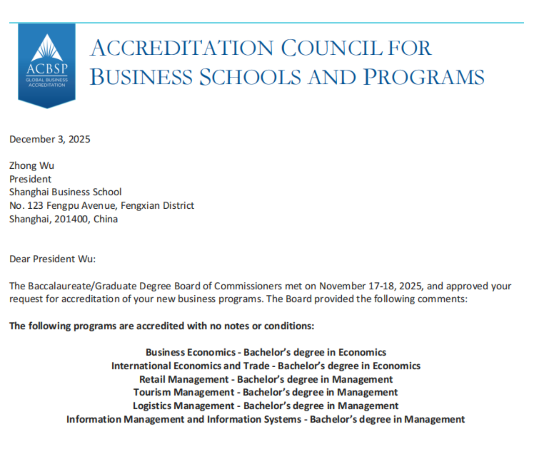 ACBSP认证的顺利通过,离不开学校的高度重视与支持、学院的周密组织以及全体师生的长期共同努力。展望未来,商务经济学院将以此次认证为新的起点,持续遵循国际认证规范,深化教育教学改革,积极服务国家与上海的高水平对外开放战略,努力培养更多具有跨文化沟通能力与扎实专业素养的优秀人才,为我校高水平应用型商科大学建设贡献力量。