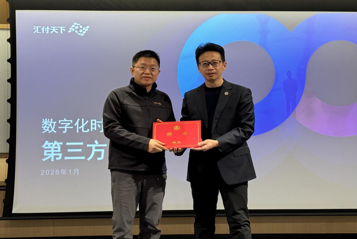 随后,专题分享环节在一楼钛客厅举行。活动伊始,上海商学院李志刚院长介绍了汇付天下有限公司首席财务官兼执行董事金源先生的职业背景,并为其颁发研究生行业导师聘书。金源在支付行业深耕多年,兼具企业高管与高校教学经验,是业内少有的正高级会计师资质CFO,同时受聘担任多所上海高校客座教授,其跨领域的实战经验为本次分享提供了深厚的行业洞察。